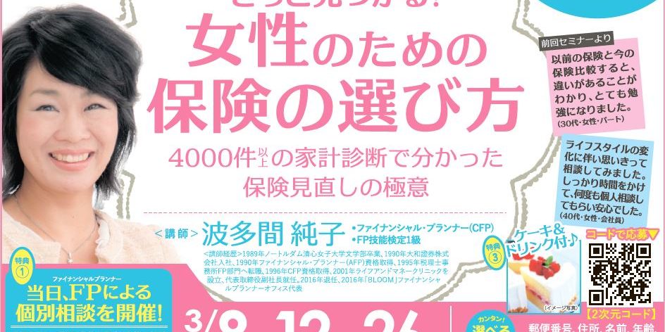 3月272017セミナー「女性のための保険の選び方セミナー」を実施いたしました。 関連記事女性のためのお金のそなえセミナー2019-11-25女性のためのマネーセミナー2019-04-01女性のための人生が変わるお金のレッスンセミナー2018-09-10