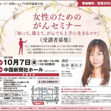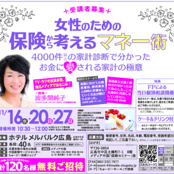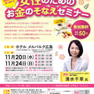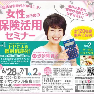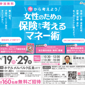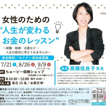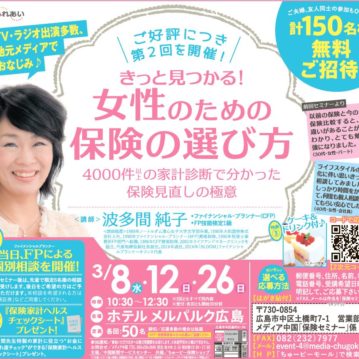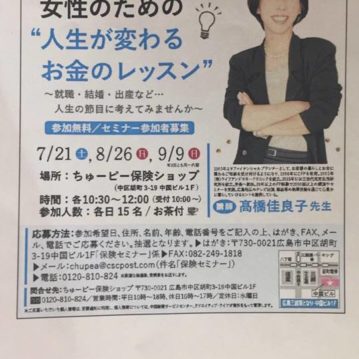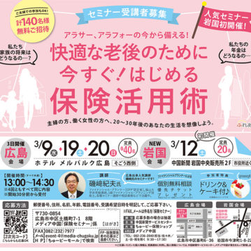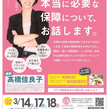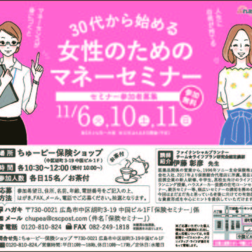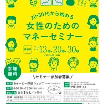 お知らせ 保険セミナーのご案内 2019-02-14 ちゅーピー保険ショップでは3月13日(水)、20日(水)、30日(土)に「20・30代から始める女性のためのマネーセミナー」を開催致します。 続きを読む
